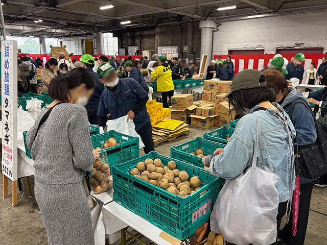 玉ねぎ・じゃがいも・みかんの詰め放題コーナーは、参加者の行列ができ大盛り上がり。皆さんそれぞれ工夫しながら、少しでも多く詰めようと楽しくチャレンジしていました。