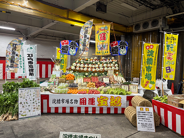 淀橋市場名物の「宝船」コーナーでは、色とりどりの野菜や果物が豪華に盛り付けられ、訪れた方の目を引いていました。今回は、売買参加者の帽子とエプロンを着用し、「なりきり八百屋さん」として宝船の前で記念写真が撮れるフォトスポットとしても楽しめました!