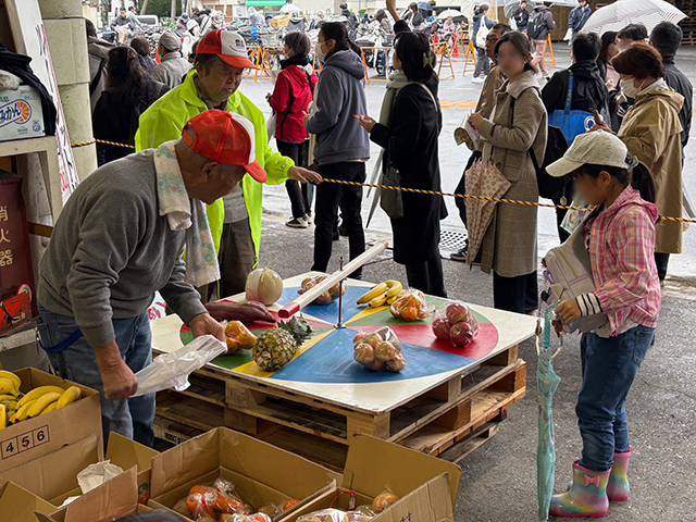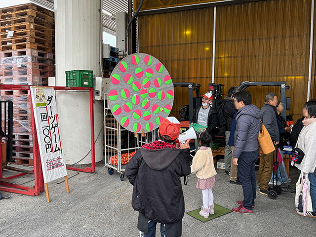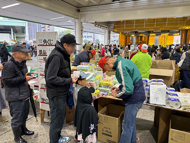 次はイベントコーナーです。三角くじコーナーでは、市場まつりに来た人を歓迎するため、先着1000名に無料でくじが配布されました。