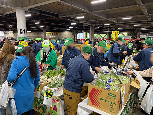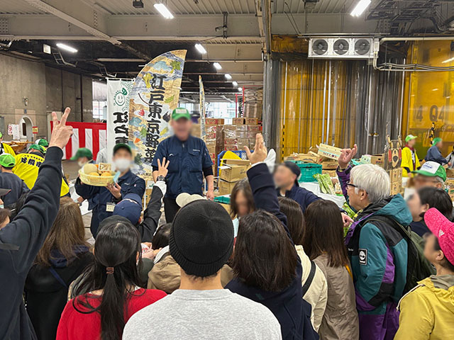 青果の販売コーナーには、市場ならではの新鮮な野菜や果物がずらりと並びます。現場で活躍する本物のせり人さんによる軽妙なトークも見どころのひとつ。市場ならではの活気に包まれ、訪れたお客さんも思わずワクワク。自然と笑顔が広がっていました。