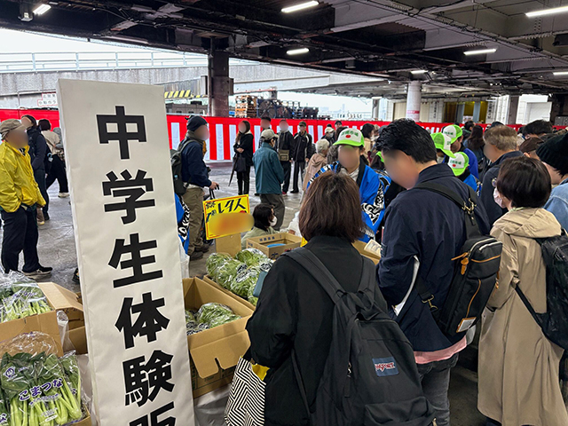 こちらは地元中学生による販売体験コーナーです。東日本大震災以降、福島県産農産物の風評被害を払拭することを目的に、中学生が販売を体験する取組が10年以上続けられています。当日は生徒さんの友人やご家族も多く訪れ、温かい応援に包まれながら、大きなにぎわいを見せていました。