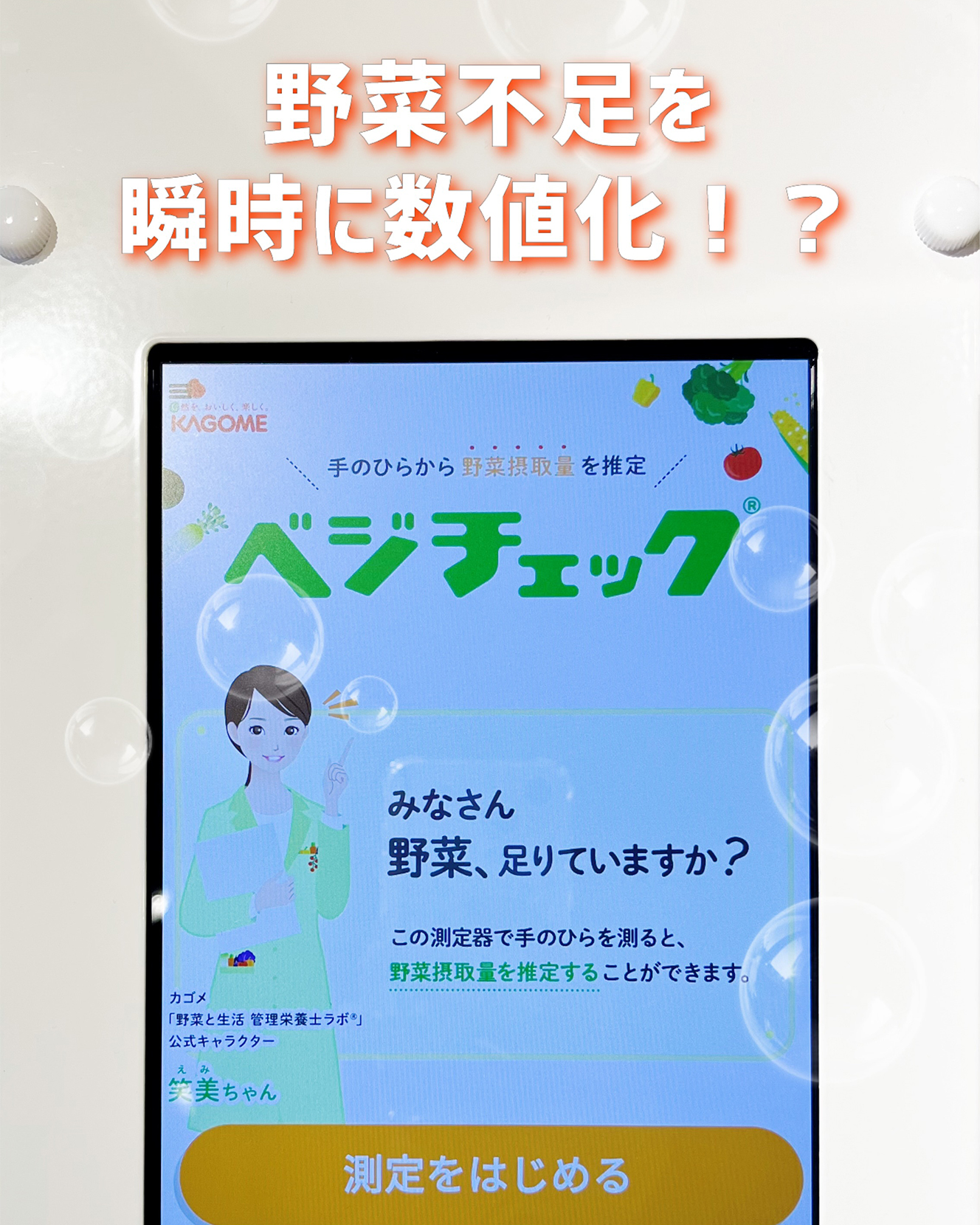 また、手のひらをセンサーにあてて推定野菜摂取量を測定できる「ベジチェック®(カゴメ)」体験では、来場いただいた方々から「食生活を見直すいい機会になりました」といった声をいただきました。