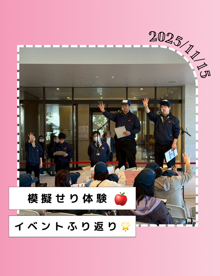 模擬せり体験では、プロのせり人から「手やり」を教わり、旬の青果を実際にせり落とす体験を実施。値段が決まるまでのやり取りを体験することで、市場の仕事や役割を身近に感じられる場面となりました。